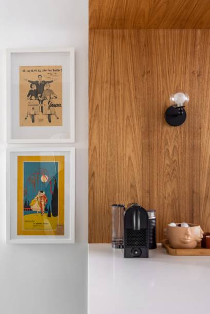 A iluminação é feita com um sistema de trilhos que dispensa o uso de forro de gesso, criando um ambiente moderno e clean.