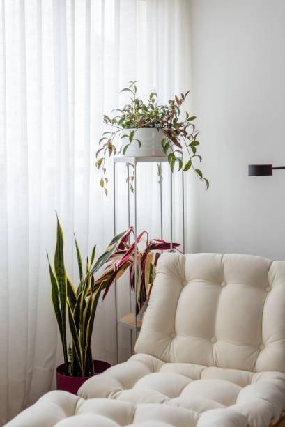 A sala de estar tornou-se um refúgio extra com um espaço dedicado à leitura, envolto em paredes pintadas com a tonalidade do branco neve. Essa escolha cromática, embora neutra, é uma tela em branco que reflete a essência do morador, ganhando vida e caráter por meio das peças de arte selecionadas, como quadro e objetos de decoração.