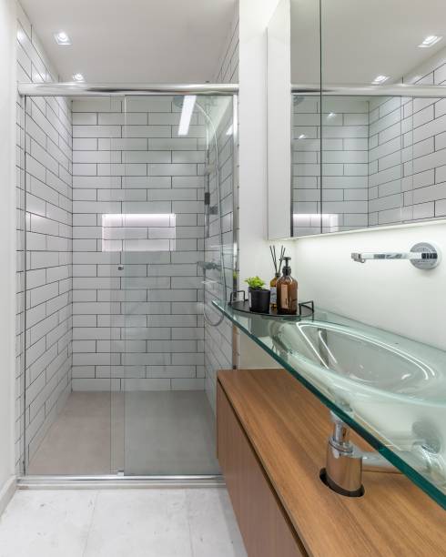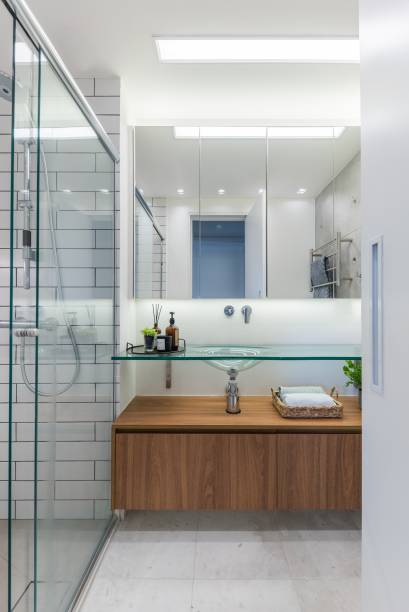 No banheiro, a bancada de quartzo e azulejos brancos com pontinhos verde menta, concebeu uma atmosfera fresca e moderna. Na marcenaria, o gabinete de MDF com revestimento amadeirado tipo Freijó possui em tom mais escuro, fazendo um contraponto com o branco e aquecendo o ambiente.