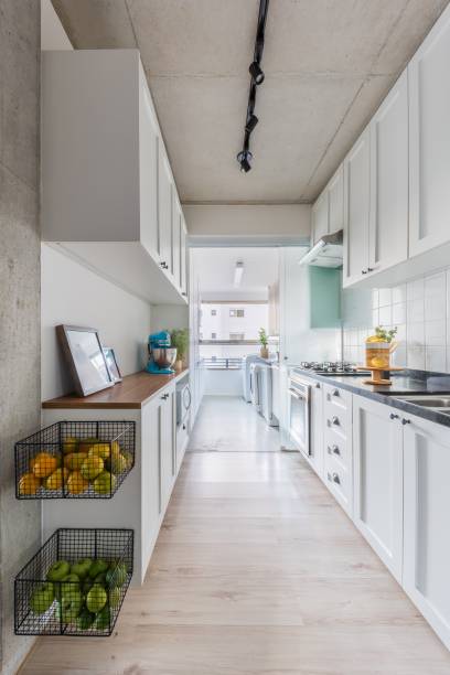 Como a cozinha é do tipo corredor (2 x 3m), Júlia trabalhou em modificações que a fizeram parecer maior. Um dos recursos foi a instalação do mesmo piso presente nos demais cômodo – um laminado com aparência de madeira.
