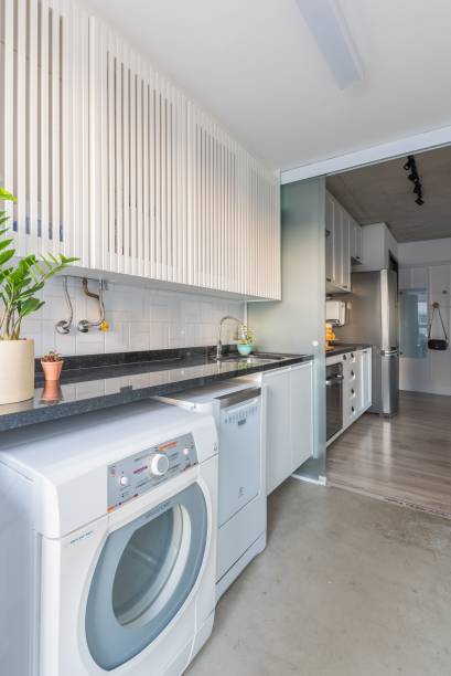 Sendo praticamente uma extensão da cozinha, a lavanderia do apartamento foi eleita para armazenar os materiais empregados na produção os bolos artesanais da moradora. Os armários de madeira ripada na parte superior escondem o aquecedor a gás de uma maneira segura e eficiente.