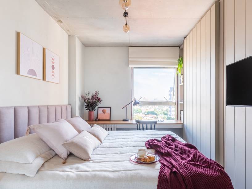 Na ala íntima do apartamento, o quarto do casal é super aconchegante. Nele, Júlia também optou por acabamentos claros como o cimento queimado na parede, a cabeceira estofada, o armário com porta ripada que embutiu a TV e outros elementos que propiciaram uma atmosfera calma e relaxante.