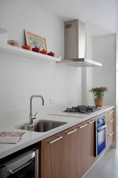 Outro destaque da cozinha é a bancada na parede ao fundo, com marcenaria que assume várias funções: o tampo retrátil com dois banquinhos embaixo, por exemplo, vira uma pequena copa. Ao lado dela, a mini-adega e a cervejeira acrescentam ao pequeno espaço a função de bar.
