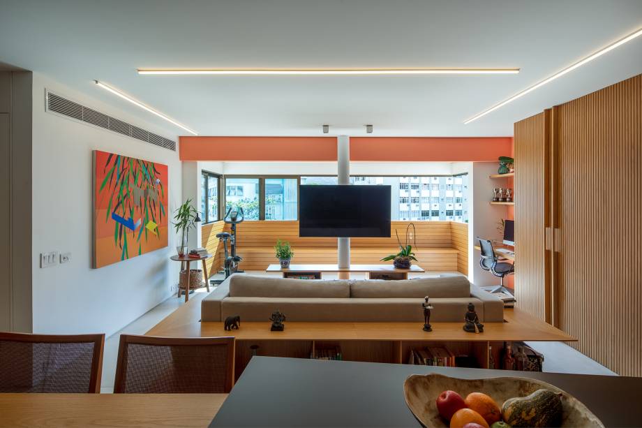 “Ao abrir o quarto e a varanda para a sala, nos deparamos com um cano de águas pluviais e, com ele, criamos um pilar redondo para esconder o cano que virou suporte de TV”, conta Meyer.