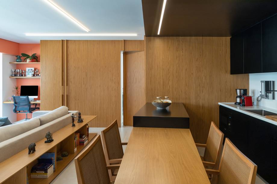 A princípio feito para passar tubulações, o rebaixamento do teto e a cor preta dos revestimentos, destacam o ambiente. Um grande lambri de madeira vai da lateral da cozinha até a varanda, escondendo todas as portas e é o fio condutor deste projeto. Quando necessário, a mesa de jantar vira uma bancada mais alta com armários e gavetas.
