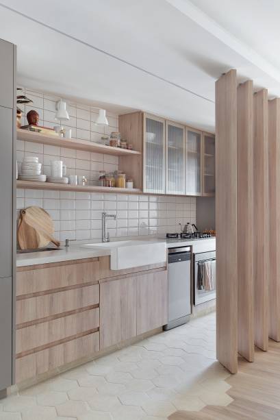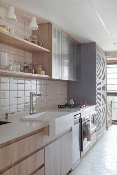 O projeto buscou criar espaços aconchegantes e estilosos, ao mesmo tempo, e adotou uma paleta de cores em tons suaves para deixar o apartamento claro e bem iluminado. A cozinha, por exemplo, tem cuba em estilo farm sink (que remete à fazenda), piso de ladrilho hidráulico com formato sextavado (que se funde com o piso de porcelanato amadeirado do setor social), paredes de cerâmica branca com toque retrô e armários com portas amadeiradas e cinza/fendi, combinadas com portas de vidro canelado.