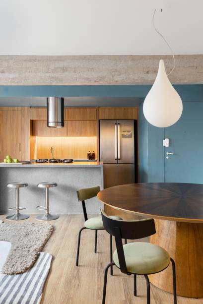 O projeto luminotécnico explora as possibilidades de iluminação indireta, minimizando ao máximo a necessidade de pontos de luz na laje. Nas marcenarias, fitas de LED no teto servem como rebatedores para gerar cenas de iluminação geral. Para a cozinha, uma luz mais funcional sobre as bancadas ajuda nas atividades diárias.