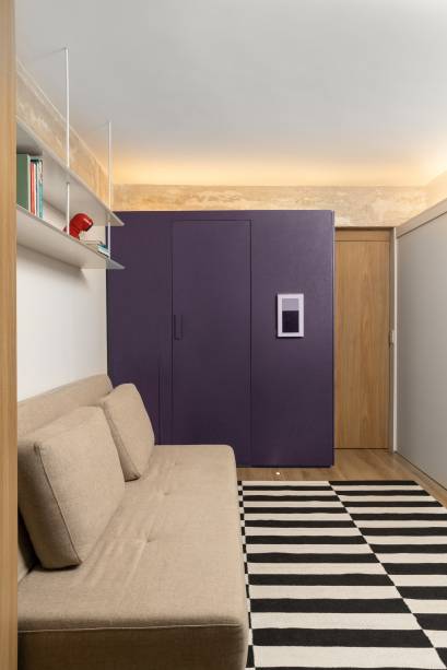 Uma marcenaria inteligente, com duas portas brancas de correr, esconde a cristaleira e a TV, podendo ser aberta ou fechada conforme o uso. Uma porta camarão em freijó, com quatro folhas recuadas, possibilita integrar a área íntima com a social.