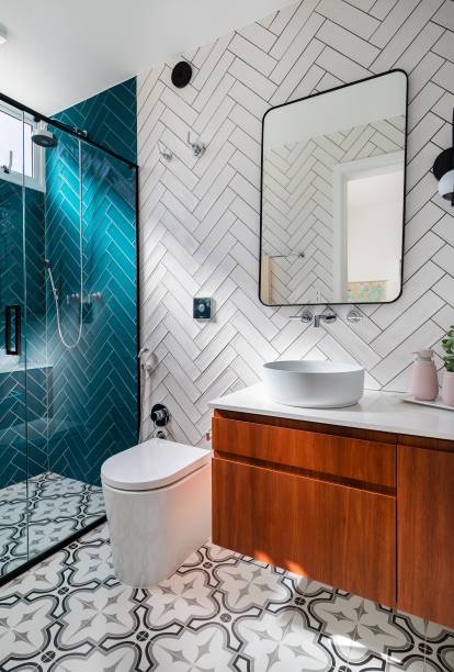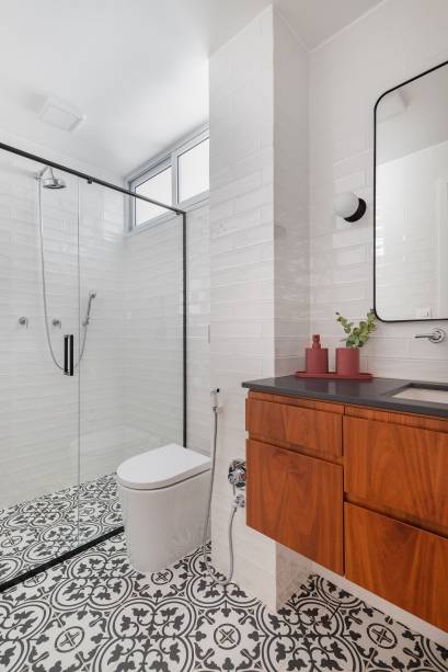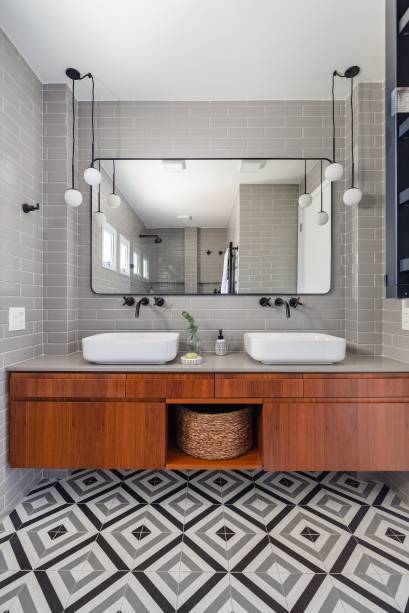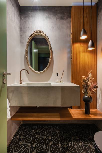 O porcelanato para o piso imitando cimento, a confecção da cuba esculpida do lavabo em placas de concreto, o reenquadre dos pilares da sala revestidos em micro cimento, no piso de azulejo hidráulico reforçam a estética mais bruta.