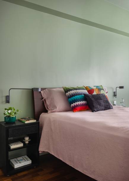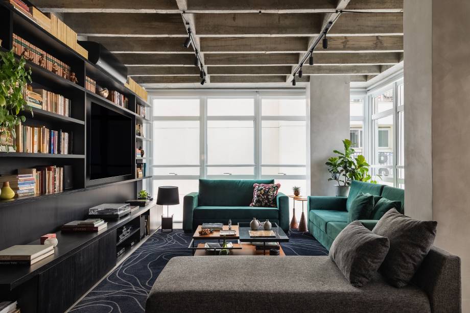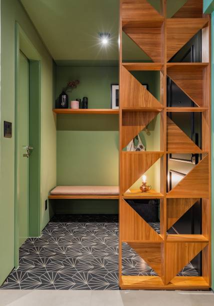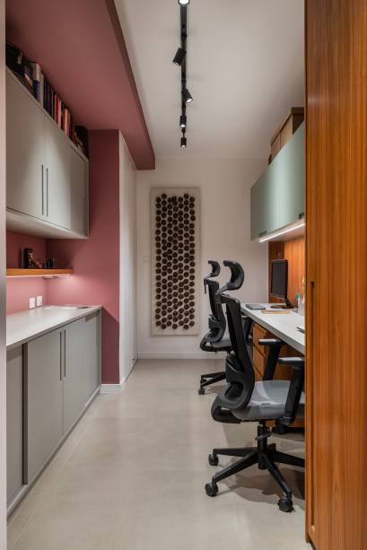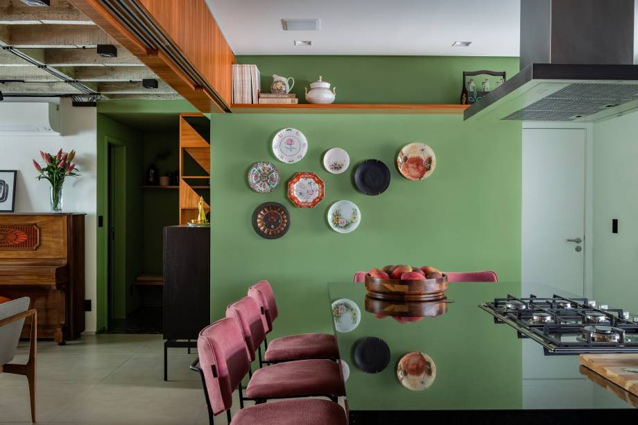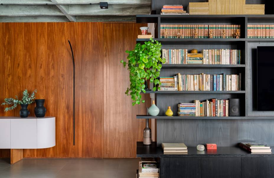 “Outro elemento importante na área social é a estante. Ela foi dimensionada para receber nossa biblioteca de livros e nossos discos, além de ser também o móvel da nossa TV”, afirma Adriana. O MDF preto foi a opção pela sua aparência elegante e atemporal, que dá destaque às lombadas dos livros. Móveis e paredes receberam a paleta verde e rosa.