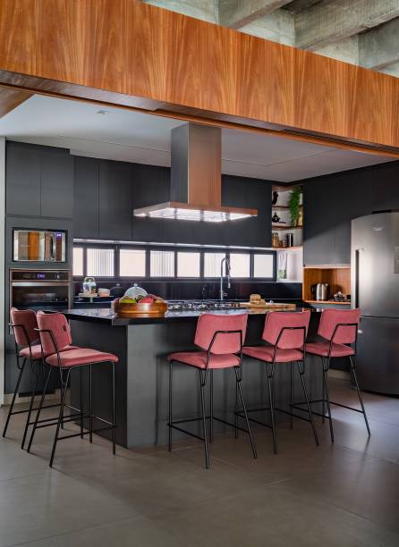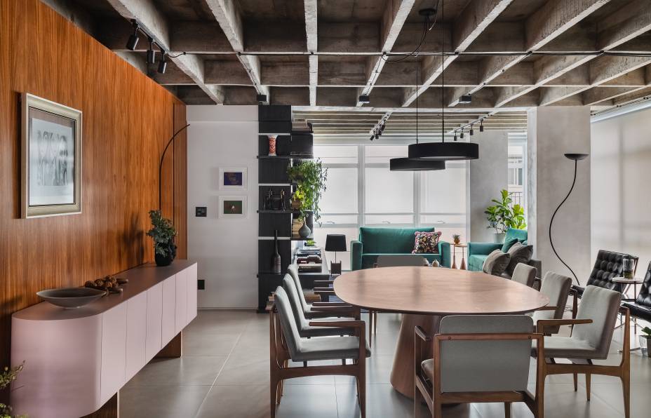 Toda a escolha de acabamentos na área da sala e cozinha foi pensada a partir da laje, e da estrutura aparente em concreto. A ideia da decoração era ora complementar a estética industrial ora contrastá-la.