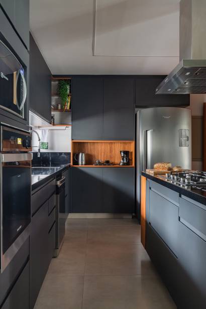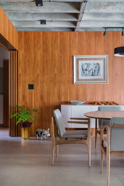 Já o uso de muita madeira, como nos cobogó da chapelaria, painel divisório da sala de estar com a parte íntima e as portas de correr da cozinha traz aconchego.
