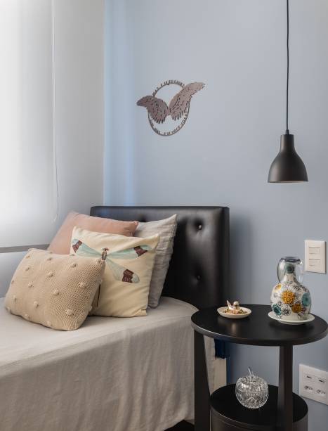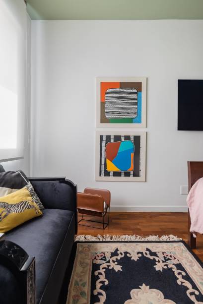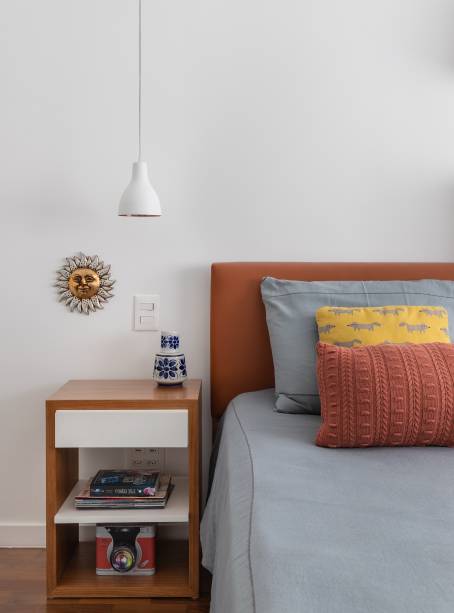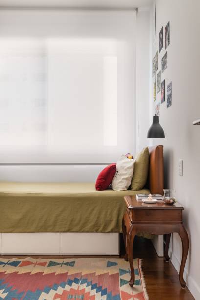 A arquiteta ressalta também a mistura de peças novas e antigas no mobiliário. “No meu quarto, a cama de casal e as mesas de cabeceira foram desenhadas por mim, mas estão ladeadas pela penteadeira da minha avó e pelo sofá de mola do irmão dela”, finaliza.