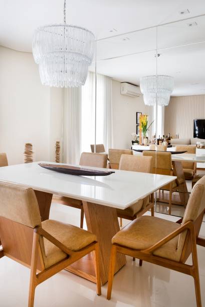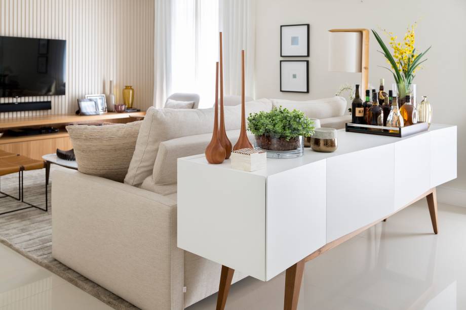Em contraste foi colocado um móvel baixo em madeira, bem limpo e sem detalhes, priorizando apenas o desenho da folha natural de freijó. Para o mobiliário, Muchon optou por seguir as mesmas cores, mas brincando com texturas de tecidos naturais, além de incluir o couro caramelo, que esquentou o ambiente.