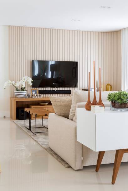 O projeto assinado por Juliana Muchon foi feito para um casal de jovens advogados cariocas, mais reservados, que procuravam ter em casa um espaço bem tranquilo e confortável para se desconectar do dia a dia. No espaço de 150 m², os tons claros de off white e nude são a essência da casa, trabalhados junto com a madeira natural ora em freijó, ora em carvalho americano. Além disso, também se vê bastante o uso de laca.