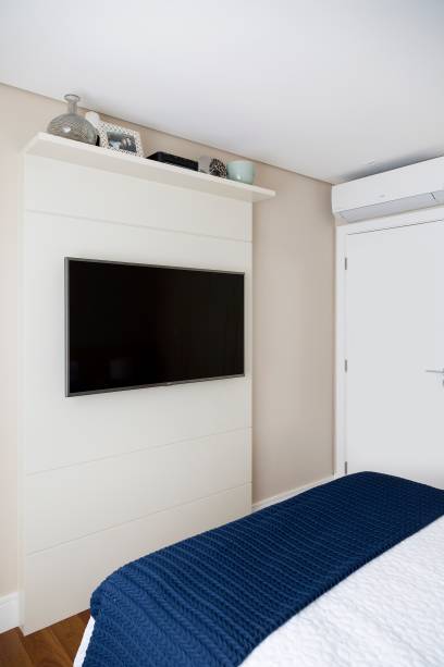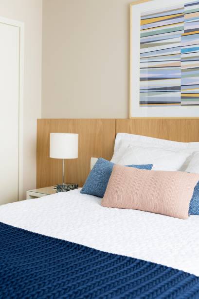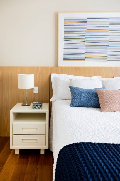 Para manter o diálogo entre os cômodos, no quarto também foi utilizada marcenaria em tom off White, similar ao painel ripado da sala, com cavas esculpidas para trazer mais elegância. O diferencial entre os ambientes foi criado com o enxoval e objetos decorativos.