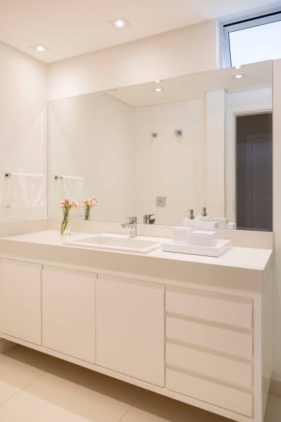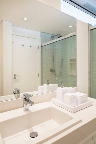 O banheiro social foi o que sofreu a maior mudança, tendo sido integrado ao antigo banheiro de serviço, a distribuição das peças foi mexida para ganhar um layout mais funcional e espaçoso.