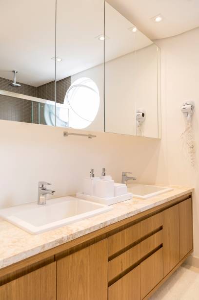 No banheiro do casal, foi retirado o bidê e movemos para o lado o vaso sanitário, o que nos permitiu criar um box grande, com dois chuveiros e um banco, em toda a parede do fundo. A bancada em mármore existente foi mantida, mas as cubas embutidas foram trocadas por modelos de sobrepor.