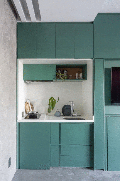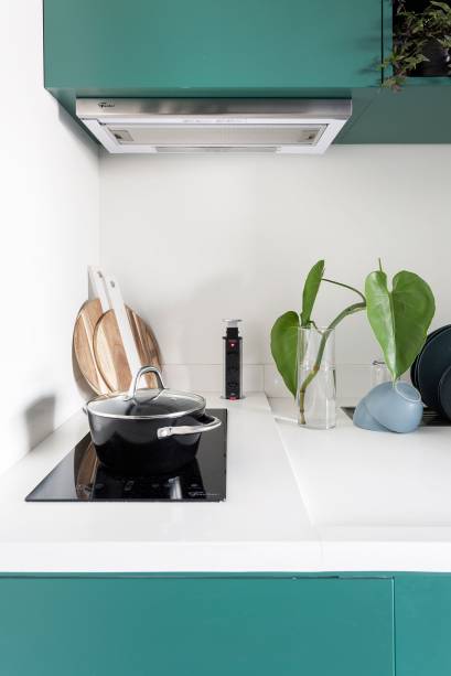 Daí, surgiu uma questão que foi deixar a cozinha e a lavanderia junto com a sala de TV. A solução foi a estante verde, que é multifuncional: cozinha, lavanderia, home theater e até despensa. Ela não tem o papel só de esconder, como também funciona como uma cozinha super compacta, mas que tem tudo o que uma casa precisa.