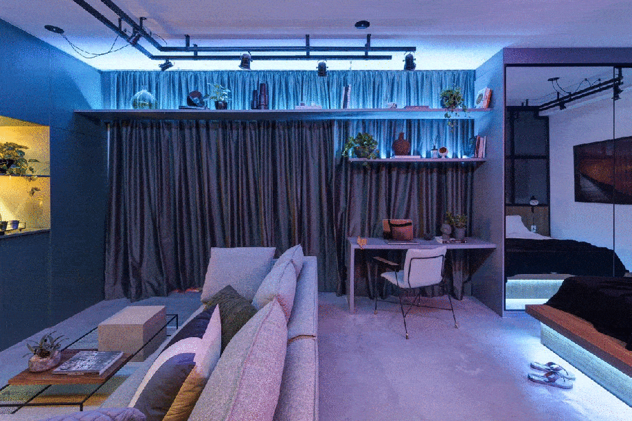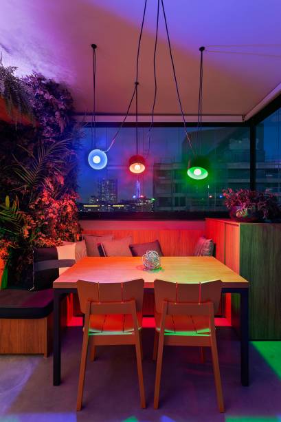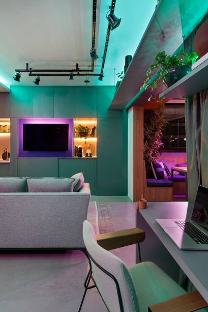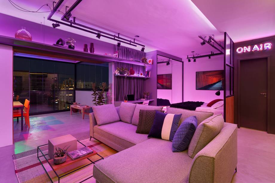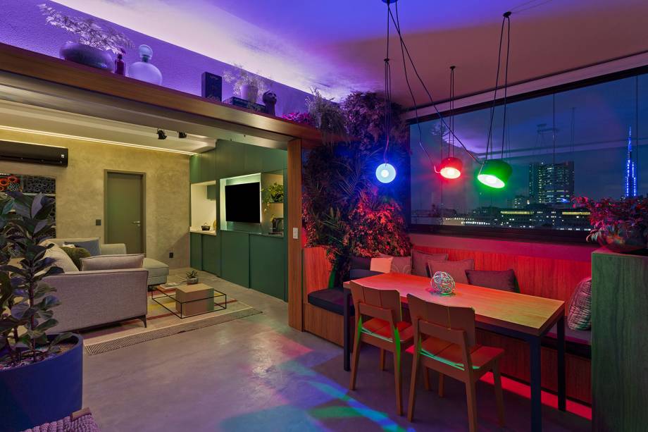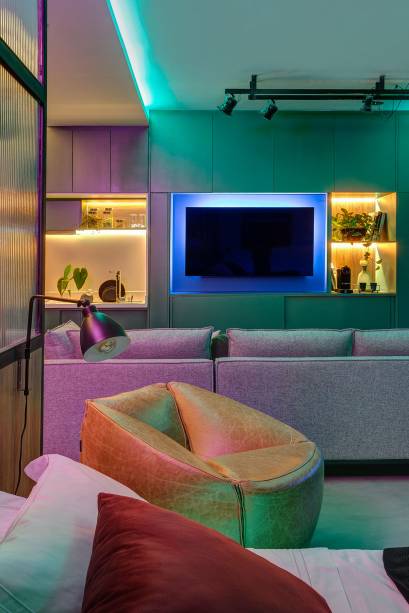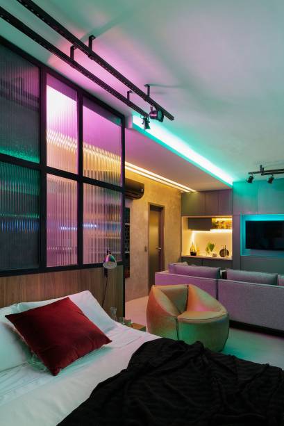 Com atmosfera calma e minimalista durante o dia, o apartamento se transforma com luzes coloridas à noite
