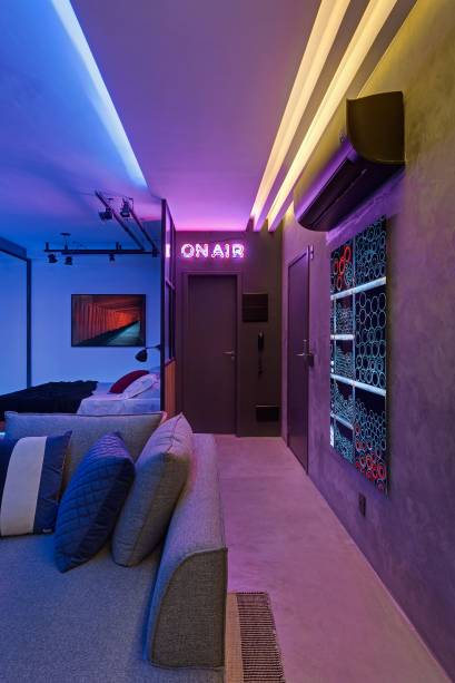 De acordo com o arquiteto, o cliente é baladeiro, gosta de música eletrônica e viaja por diversos países para ir a festivais. Por isso, a ideia foi criar um cenário clean, que pudesse mudar completamente à noite, com ajuda de lâmpadas.