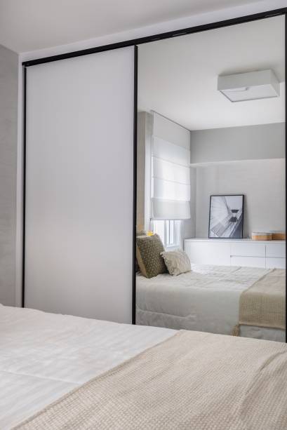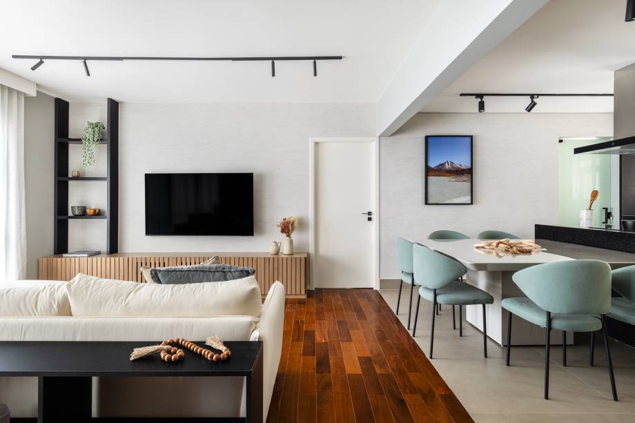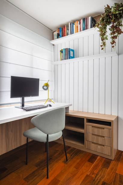 Já o escritório foi concebido para ser um espaço funcional para duas pessoas, com prateleiras abundantes para livros e um painel ripado branco, que mantém o ambiente organizado e clean, propício para o dia a dia de trabalho.