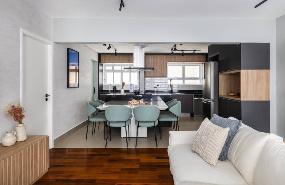 A integração da cozinha com a sala de estar se tornou um ponto focal do projeto, promovendo um fluxo contínuo e uma sensação de amplitude. Um dos elementos mais marcantes do projeto é a caixa de madeira preta que “abraça” a cozinha, um toque de design que une funcionalidade e estética.