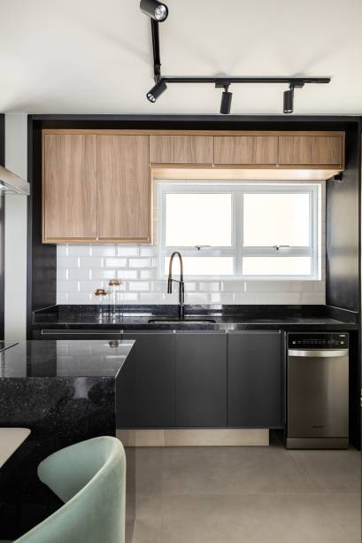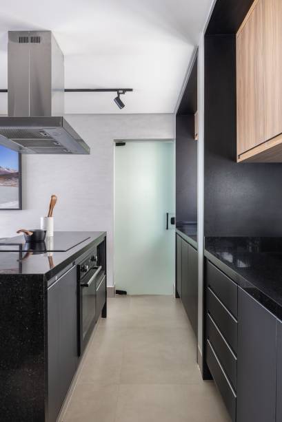 Apê tem cozinha com marcenaria preta e home office com painel ripado branco