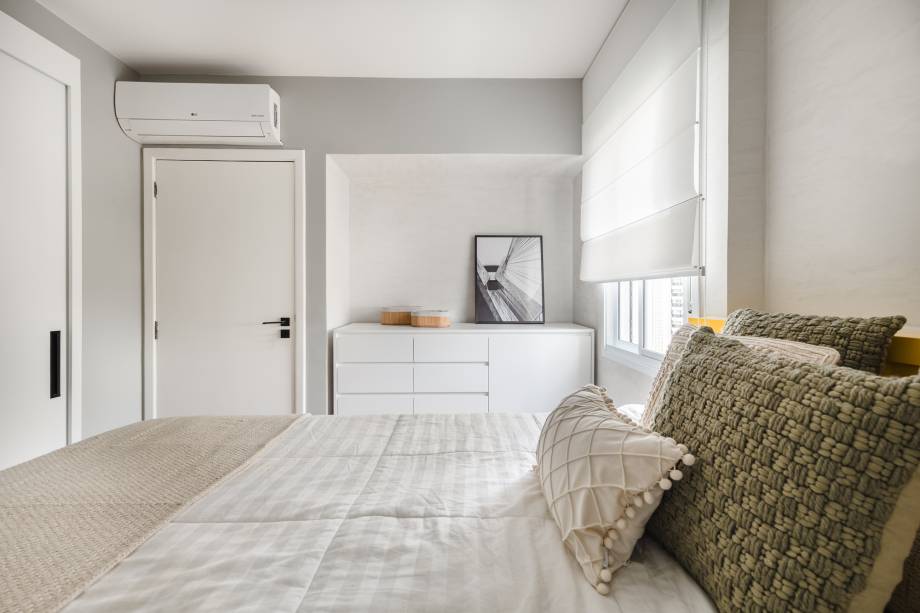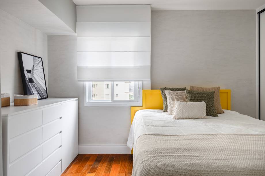 Na suíte, os moradores desejaram um refúgio mais clean, com um toque de cor que se destacasse. As paredes revestidas com cimento queimado na tonalidade broto de feijão se aliam aos armários de tons claros, enquanto uma cabeceira laqueada amarela serve como o elemento surpresa.