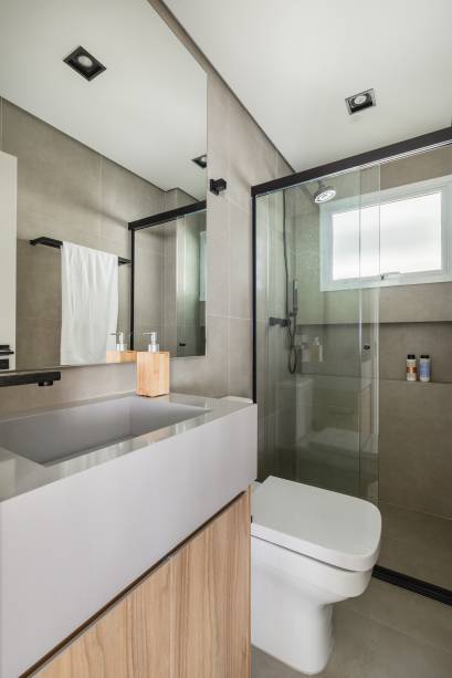 E por fim, os banheiros seguem o mesmo estilo refinado e coeso do restante do apartamento, com revestimentos uniformes e detalhes, como espelhos com iluminação embutida e nichos que se integram perfeitamente às paredes.