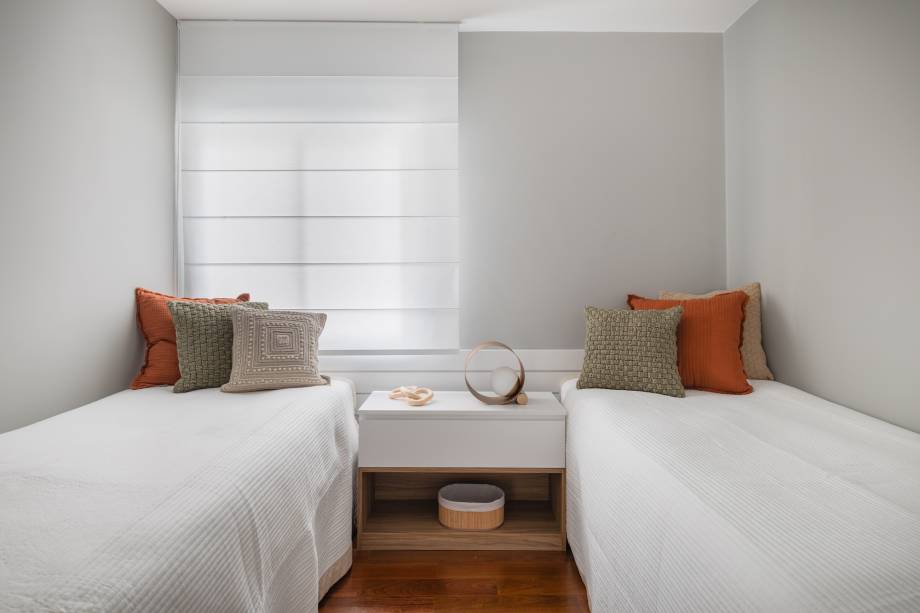 Para acomodar hóspedes, já que a família dos moradores reside no exterior, um quarto de visitas foi cuidadosamente arranjado com duas camas de solteiro, proporcionando conforto e privacidade. A peça em destaque é uma luminária de mesa, criação da designer brasileira Nathalia Araújo, que não só ilumina como também serve como um ponto de interesse artístico no quarto.