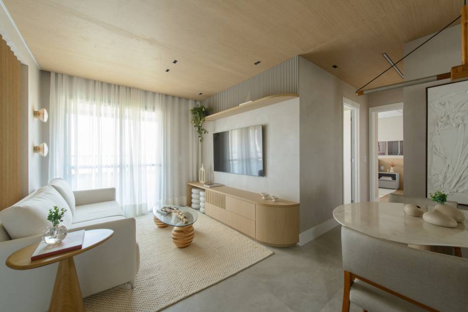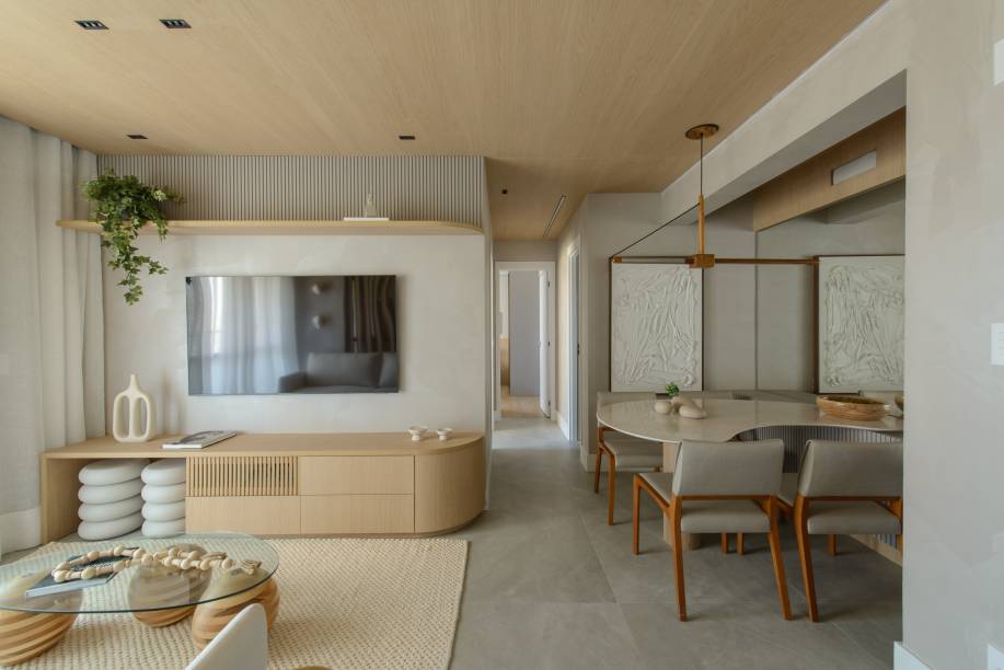 O design inteligente possibilita que a área social se torne um espaço mais amplo, pensado para ser o mais aconchegante possível. O forro do teto, amadeirado, trouxe um toque de acolhimento e sofisticação em todo o espaço, que recebeu piso em porcelanato Portobello. Já a bancada da cozinha recebeu quartzito Taj Mahal, que confere um ar mais sofisticado.