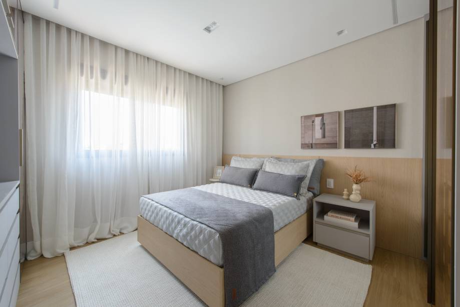 Os quartos receberam piso vinílico para maior conforto. O quarto da filha ganhou a “Cadeira Sushi”, assinado pela designer Linda Martins. No banheiro e lavabo, o uso de Seixo Rolado da Palimanan adicionou textura e personalidade. E o banheiro também recebeu suportes de toalhas desenhados com serralheria artística, que adicionam sofisticação ao ambiente.