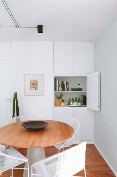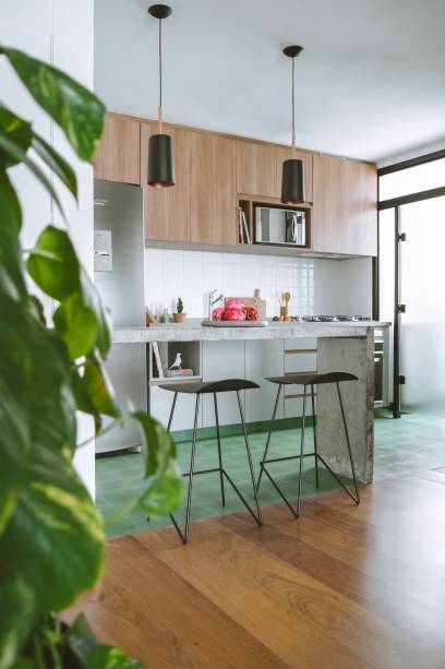 Com a demolição da dependência de funcionários existente na antiga planta baixa do imóvel, foi possível aumentar a área do cômodo, o qual ainda recebeu uma bancada de cimento em um ‘L’ invertido, que remete ao brutalismo, e banquetas que tanto servem o morador durante as refeições rápidas, como acolhem seus convidados. “Junto com a estrutura bastante funcional, a circulação ficou muito fluida e confortável”, complementa o arquiteto.