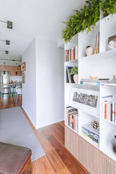 Na sala de estar, o destaque fica por conta da marcenaria da estante com os diversos nichos que acomodam os objetos decorativos.