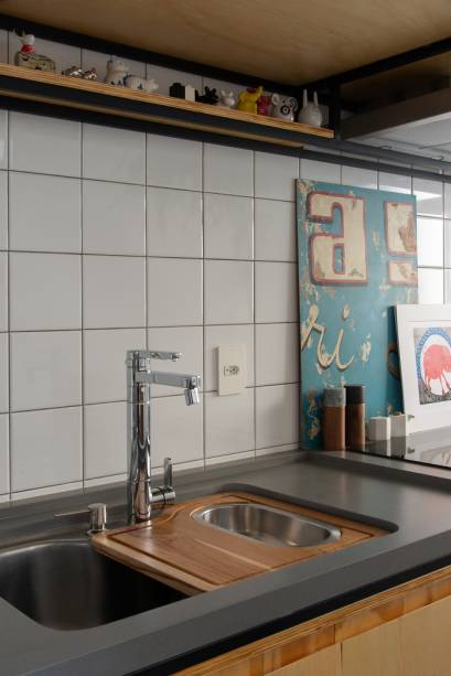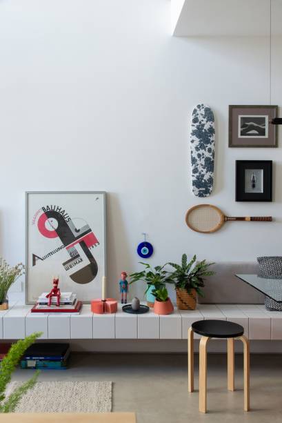 “No mesmo pavimento, para reforçar a ideia de integração do espaço, criamos um banco revestido com azulejo 15×15, que percorre todo comprimento do apartamento. Ele conecta os ambientes e tem várias funções; banco, bancada e móvel para TV e aparelhos”, contam os arquitetos.