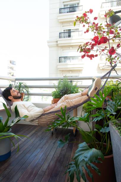 - Dúplex de 48 m² com cozinha colorida e rede na sala