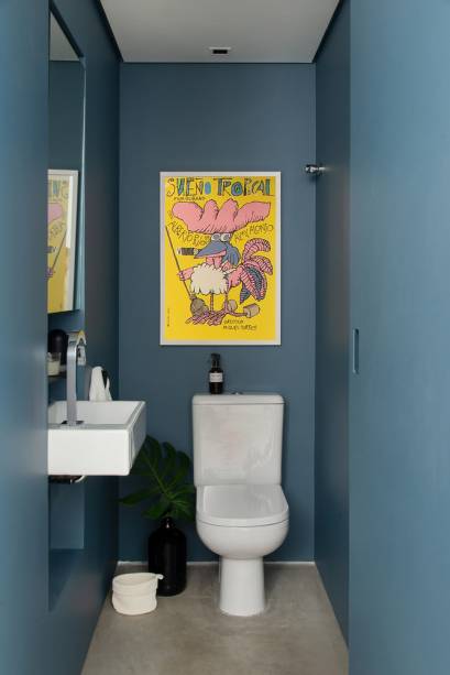 A escada de concreto existente foi mantida, criando um volume que incorpora o lavabo e o espaço abaixo dela que virou uma despensa. Eles receberam revestimento em marcenaria pintada de azul com portas mimetizadas.