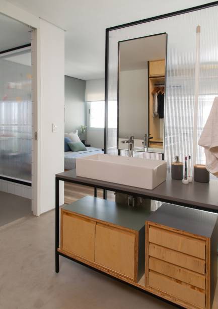 No pavimento superior, um closet aberto abriga a área da cuba, dando assim mais espaço para o box e bacia. Um grande vão foi aberto nesta área para entrada de luz natural, enquanto uma cortina de rolo e policarbonato alveolar garantem uma maior privacidade. O mesmo material também foi usado em um fechamento leve de serralheria, que protege o closet da vista do pavimento térreo.