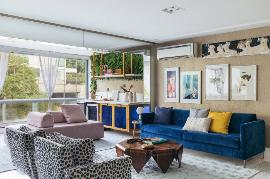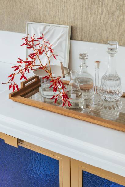 “Como a paleta de cores tem bastante personalidade, não nos limitamos somente às paredes e seguimos com os mesmos tons em outros elementos da decoração. O dourado fosco e o vidro ártico azul, por exemplo, aparecem no móvel-bar de serralheria que desenhamos para a antiga varanda”, ressalta.