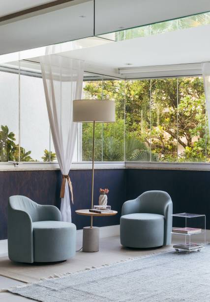 Na decoração, alguns quadros já faziam parte do acervo do casal e foram mantidos, mas trocados de lugar – a exemplo do quadro de palmeira gigante, na sala de jantar, do artista Marcos Nadaleto. Os sofás e as poltronas giratórias da sala também já existiam e foram reestofadas com novos tecidos.