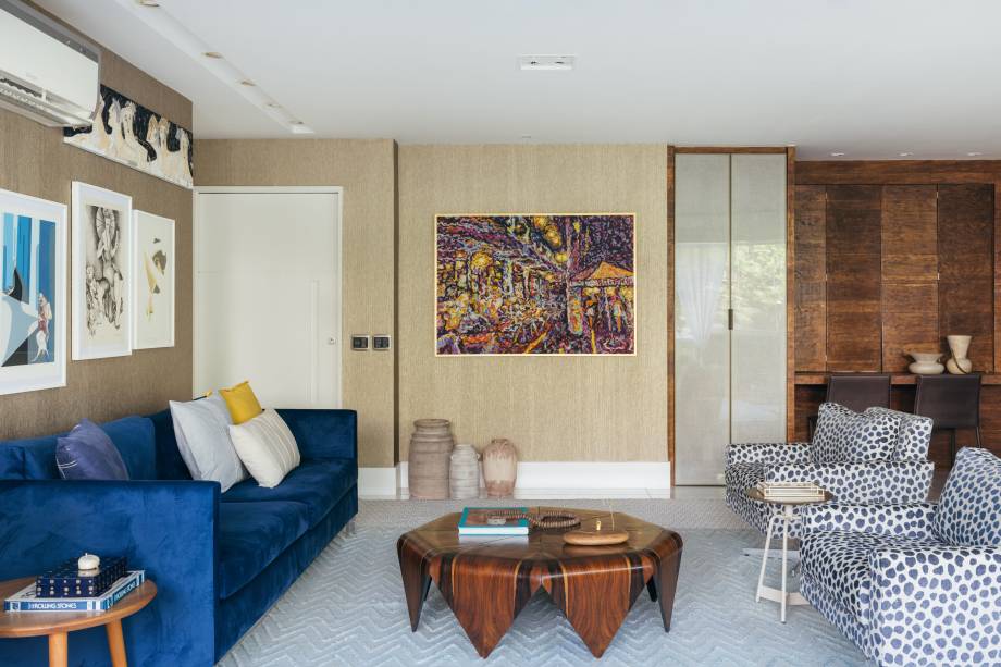Na sala, o arquiteto destaca ainda algumas peças de mobiliário, como a mesa de centro Pétala (assinada por Jorge Zalszupin), o sofá-ilha Burgos, o banco Gomo e as poltronas giratórias Bee (da Novo Ambiente) e a mesa lateral com luminária acoplada Giro (da Way Design).