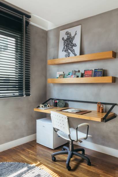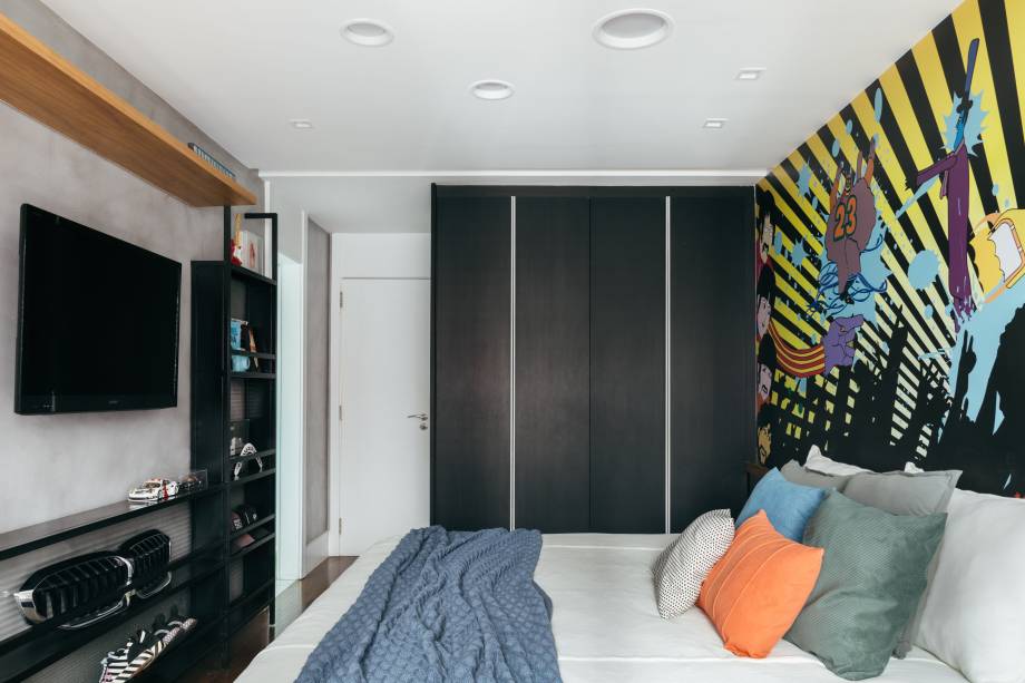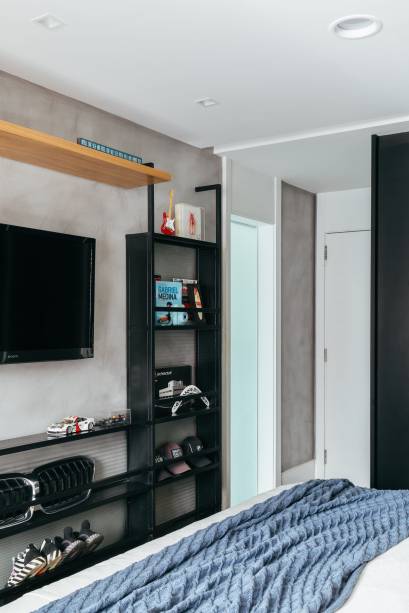 Já no quarto do filho, roubam a cena a estante de TV em serralheria preta e vidro canelado, as prateleiras que servem de apoio aos itens relacionados aos hobbies (como revistas e livros de surfe, tênis, bonés, legos e universo automobilístico) e a bancada de estudo em serralheria preta e freijó natural e a cabeceira da cama feita com painel magnético de inox e molduras em freijó, tudo desenhado pelo próprio arquiteto.