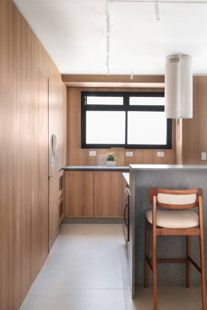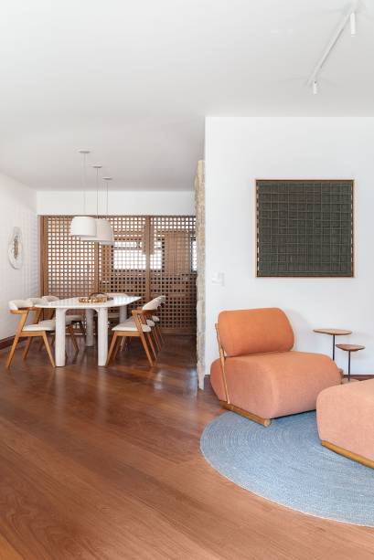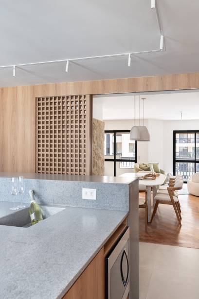 Para isso, foi preciso fazer uma grande reforma no imóvel de 160 m². Todas as paredes da cozinha, área de serviço e dependências foram derrubadas permitindo o surgimento de um grande living e a entrada de muito mais luz natural no ambiente social. Para criar uma divisão entre cozinha e sala de jantar, Mariana desenhou um painel de muxarabi.