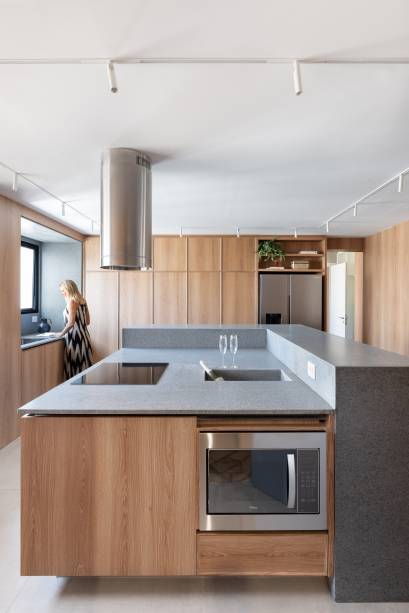 A cozinha, com uma grande ilha em granito andorinha que se estende por toda a área social, foi planejada de forma a trazer muita praticidade e funcionalidade ao dia a dia do casal. Ali, foram implementadas soluções como uma calha úmida que organiza a louça de maneira que não possa ser vista da sala e até uma champanheira esculpida na própria pedra com ralo independente.