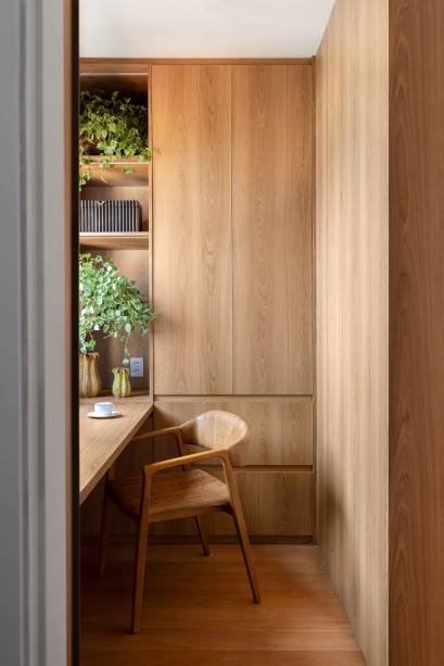 Já na ala social, um dos quartos foi revertido para ser o “cloffice” (closet + escritório) da moradora. Ali, além de muita área de armazenamento, o escritório ganhou um backoff para videocalls. Na suíte principal, tons suaves de branco e bege criam um clima relaxante e aconchegante.