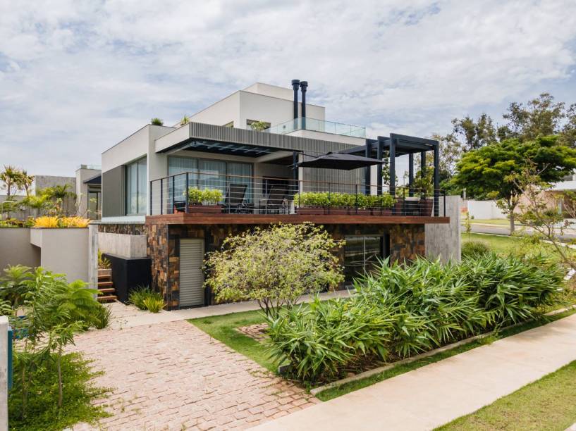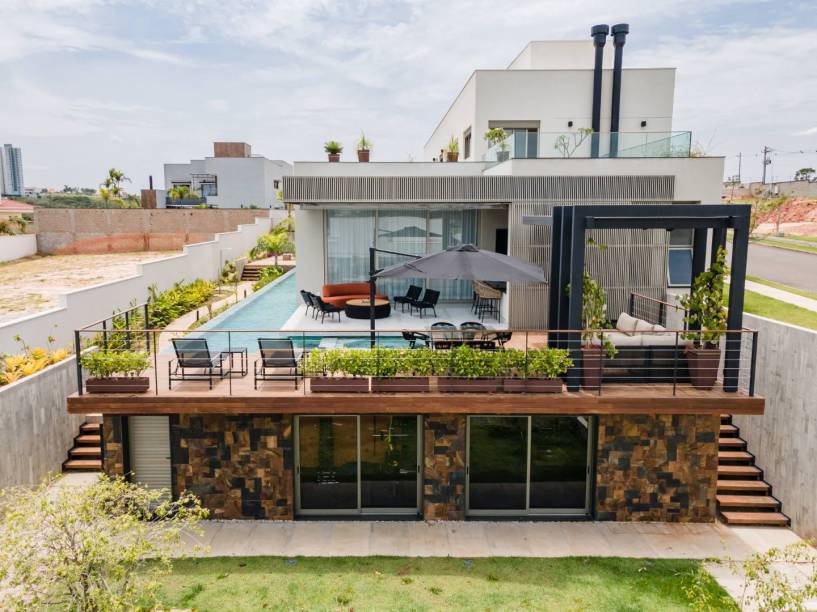 Com arquitetura de Adriano Salles e interiores de Sabrina Salles, este projeto também conta com uma piscina em L que acompanha toda a área social