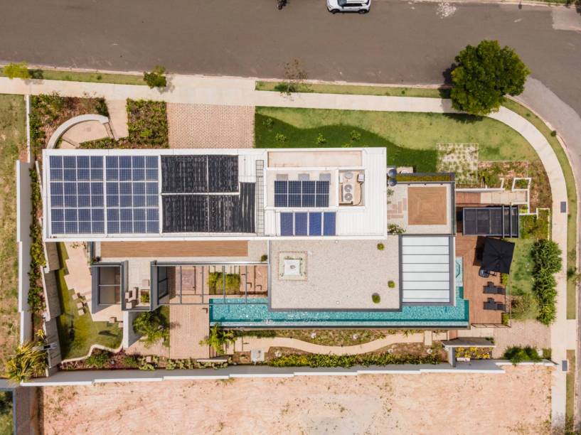 A residência também possui 70% do consumo energético alimentado por placas fotovoltaicas, criando um consumo de energia sustentável e econômico para os moradores.