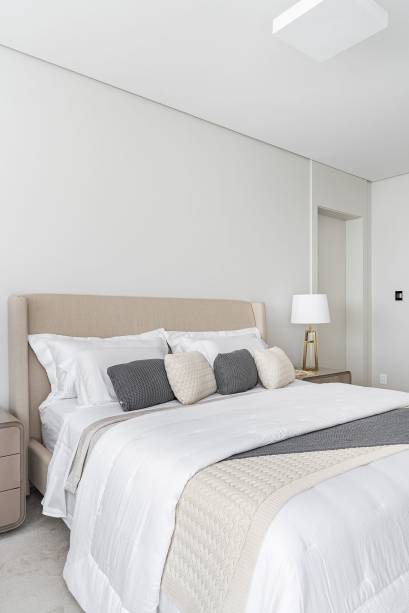 Já a suíte master possui uma paleta de cores claras, com tons de cinza e fendi, chaise e mesa de apoio, que pode servir de espaço de home office. O espelho de piso foi acomodado estrategicamente de frente para a porta e corredor, transmitindo sensação de amplitude.