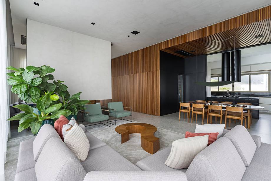 Para amenizar a grande incidência solar no lounge, placas soltas ripadas, que funcionam como portas de correr, permitem que os moradores escolham onde deixar a sombra. Além disso, os brises possibilitam manter a integração visual, quando em uso, ou o acesso livre, quando recuados, entre os ambientes. O material também cria o desenho da fachada junto com a parede de pedra ferro.